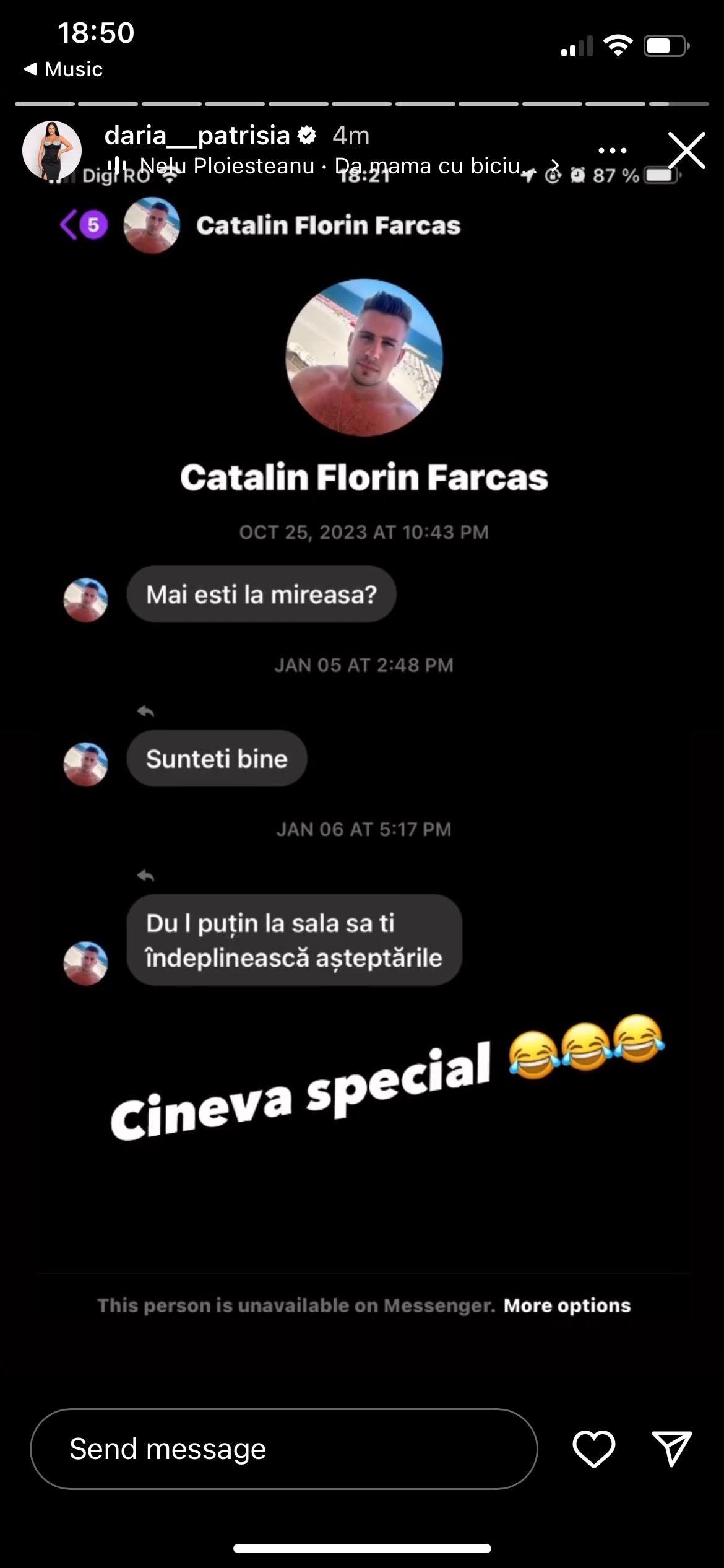 „Mai ești la Mireasa? Sunteți bine? Du-l puțin la sală să-ți îndeplinească așteptările”, au fost câteva dintre mesajele pe care Cătălin i le-a trimis Dariei. După ce ea a făcut public mesajele de lael, acesta i-a mai trimis niște mesaje agresive acesteia.