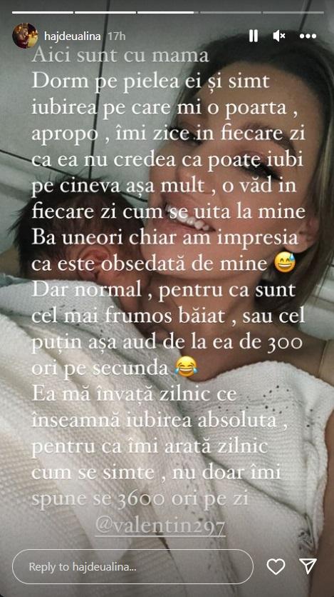 „Sunt băiat mare, Heracles-Iosua este numele meu. O să încep să apar mai des la mama aici. Aici vă arată mama ce tată grijuliu și implicat am. Nici măcar nu i-a fost frică să mă țină în brațe în prima zi. Ba chiar mai mult, i-am recunoscut vocea din prima clipă când mi-a vorbit. Și am zâmbit și am deschis un ochi la el”, a scris Alina în dreptul unei fotografii cu Heracles și Valentin.