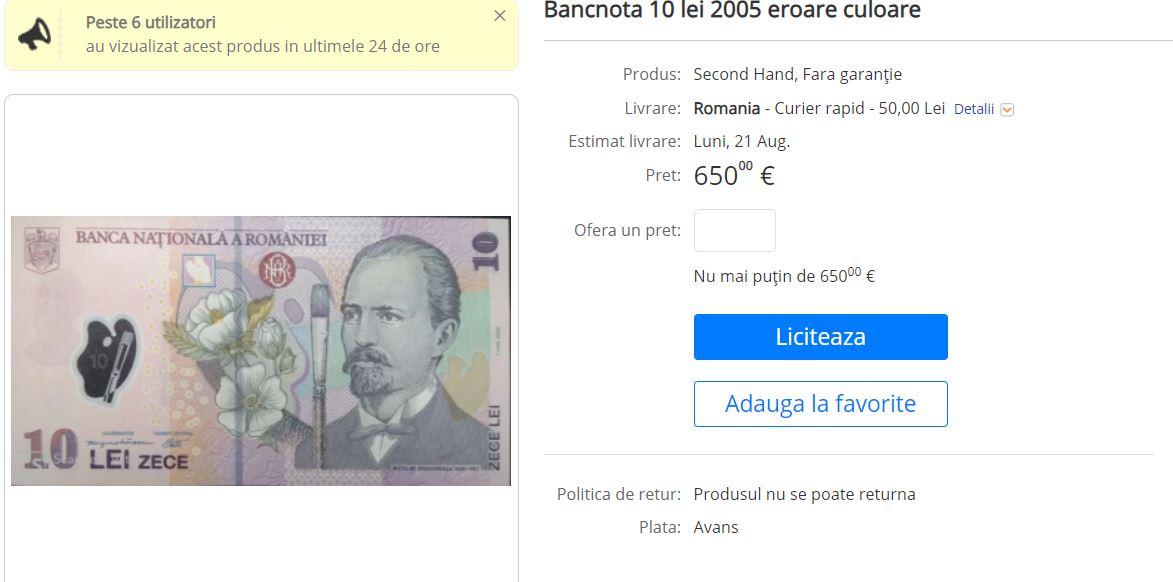 Pe alt site, Okazii, o singură bancnotă de 10 lei din 2005, cu eroare de culoare, se vinde cu 650 de euro. Altcineva vinde același ban cu 500 de euro.