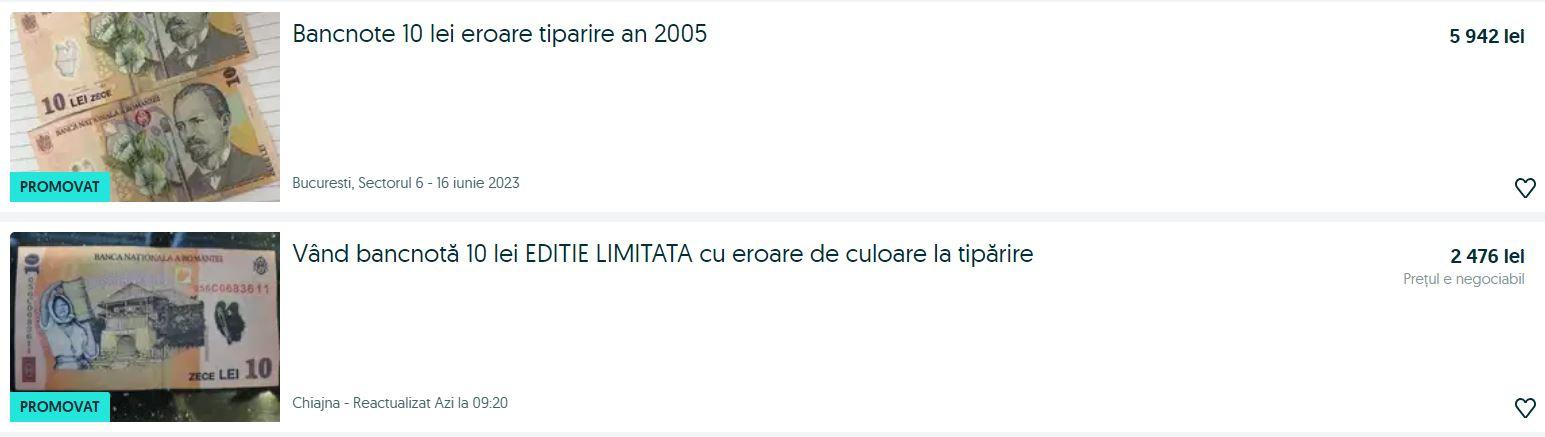 Un astfel de anunț circulă în mediul online. O doamnă vinde două bancnote de 10 lei, din 2005, care prezintă o eroare de tipărire. Cere pentru ele 1.200 de euro, adică aproape 6.000 de lei.