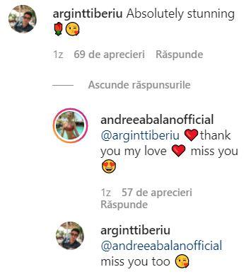 El a adăugat un comentariu “Absolutely stunning 🌹😘” (Absotul superbă), iar Andreea i-a răspuns “@arginttiberiu ❤️thank you my love ❤️ miss you 😍”, semn că el este iubitul ei. Tiberiu a simțit nevoia să își exprime și el afecțiunea în scris față de Andreea, chiar dacă a însemnat să afle toată lumea: “@andreeabalanofficial miss you too 😘”, i-a răspuns el.