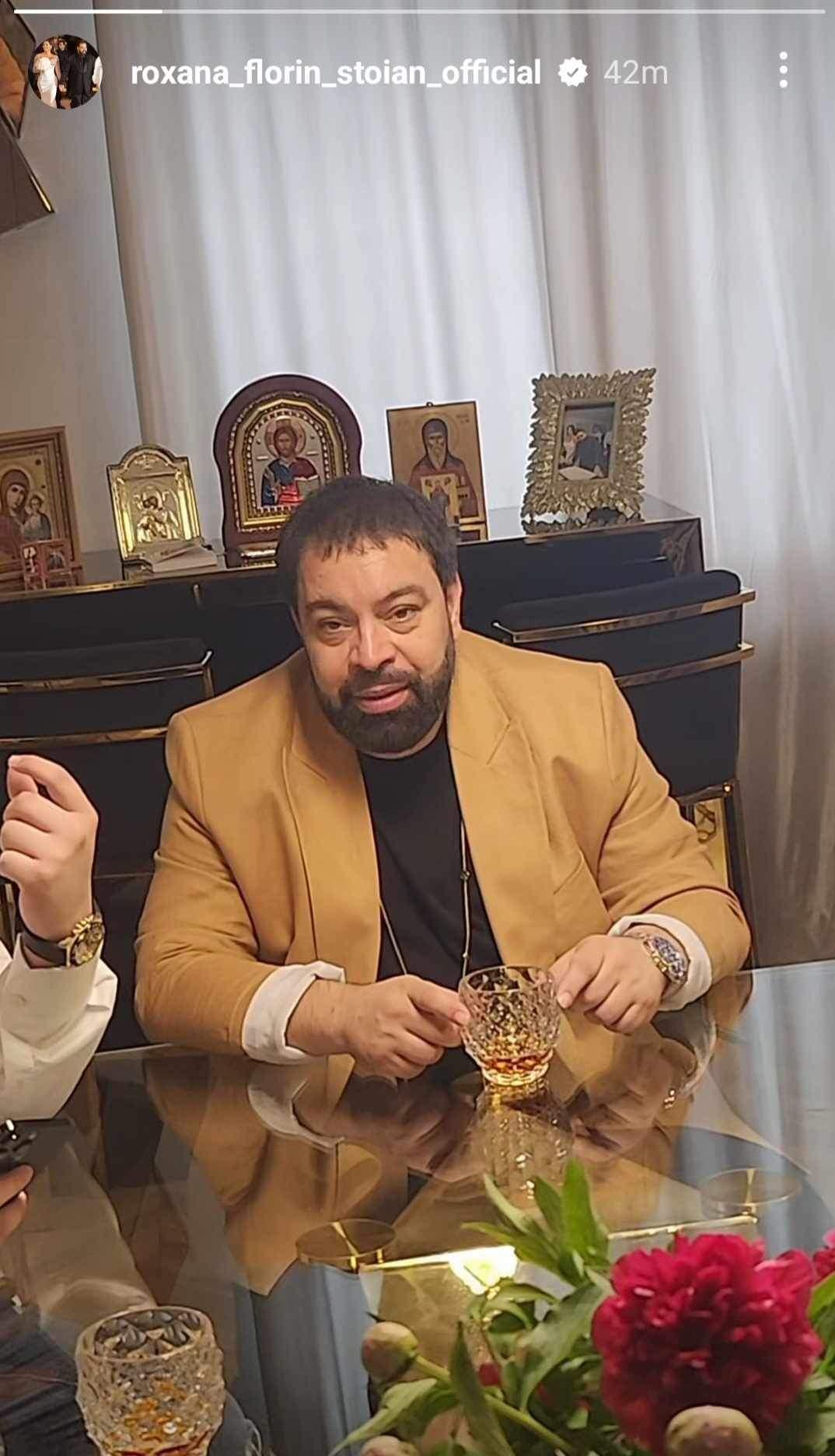 Florin Salam a petrecut prima parte a Duminicii de Florii la masă cu familia, iar soția lui a vrut să imortalizeze acest moment. Roxana Dobre l-a fotografiat în timp ce se afla la masă, cu un pahar în față. De asemenea, pe fundal, se pot observa o mulțime de icoane, dar și o imagine cu cei doi de la cununia civilă, așezată la loc de cinste.