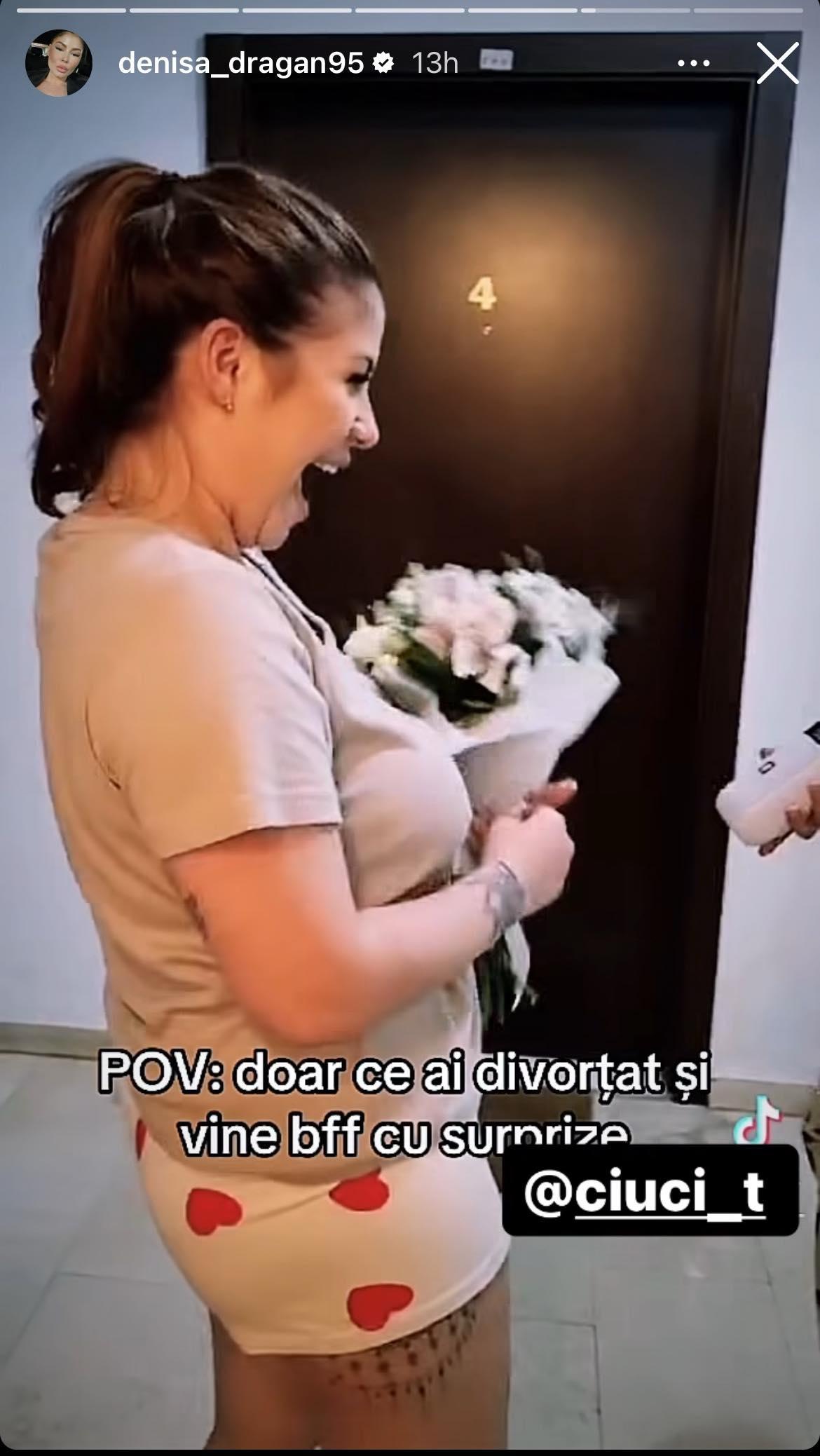 Totuși, postarea care i-a impresionat pe internauți cu adevărat este cea în care Denisa primește un buchet de flori și o sticlă de băutură de la prietena ei, bucurându-se cu adevărat de momentele petrecute împreună și sărbătorind ziua divorțului așa cum se poate vedea în imaginile de mai jos: