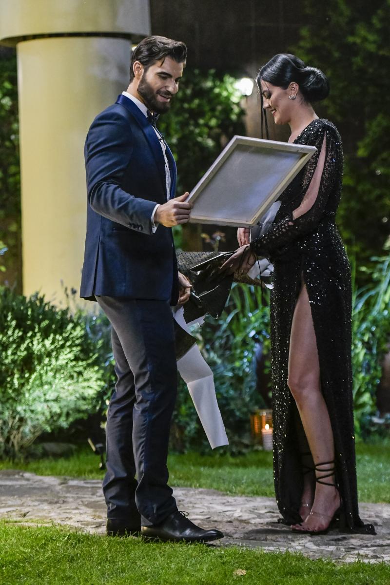 Boemă și îmbrăcată extrem de elegant, aceasta s-a apropiat emoționată de Andi Constantin cu un cadou, a făcut cunoștință cu el și am împărtășit câteva gânduri. Aceasta i-a oferit Burlacului un tablou picat chiar de ea, care înfățișează doi îndrăgostiți sub clar de lună. Andi s-a declarat încântat și impresionat de ceea ce Simona i-a oferit.