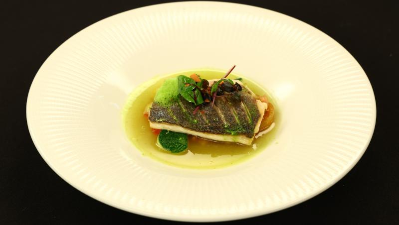 File de doradă cu apă de roșie, tartar de roșii, roșii cherry la cuptor, spumă de busuioc cu lime, bănuți de zucchini, microplante și un crocant de roșii.