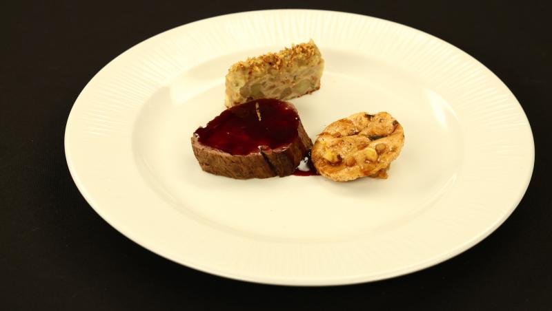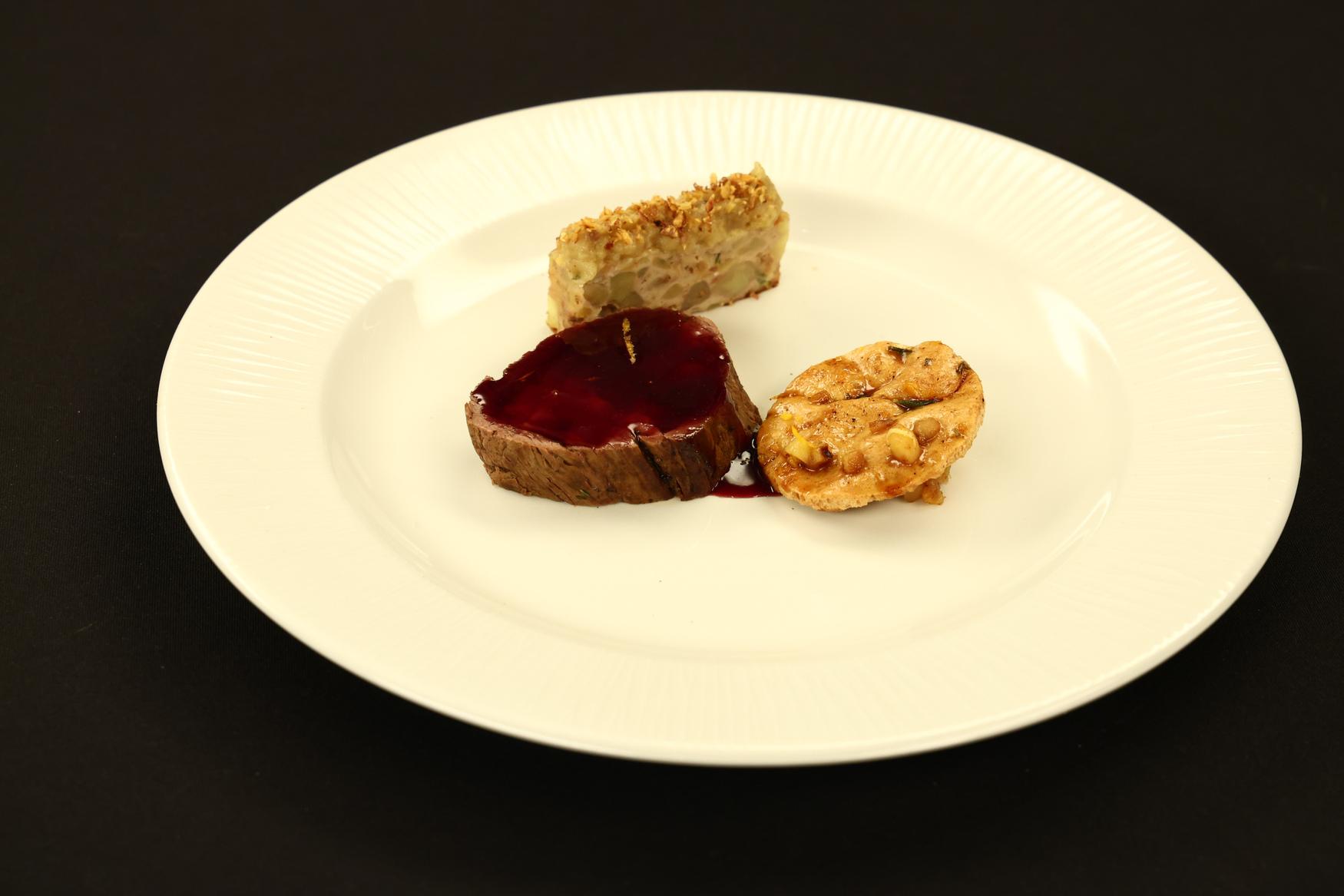 Mușchi de vită cu sos de oțet balsamic și cafea, piure de țelină cu trufe, mini vânătă a la parmigiana, dovleac fondant, brunoise de dovleac cu guanciale și muștar și noisette de dovleac caramelizat cu rodie.