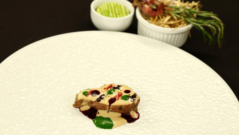Miel în 3 servici:, ragu de miel, carpaccio de zucchini și mentă, burtă de miel confiată cu fân, miel fondant în sos de fois gras și cireașă clorofilă de ierburi aromatice și pudră de cireșe.