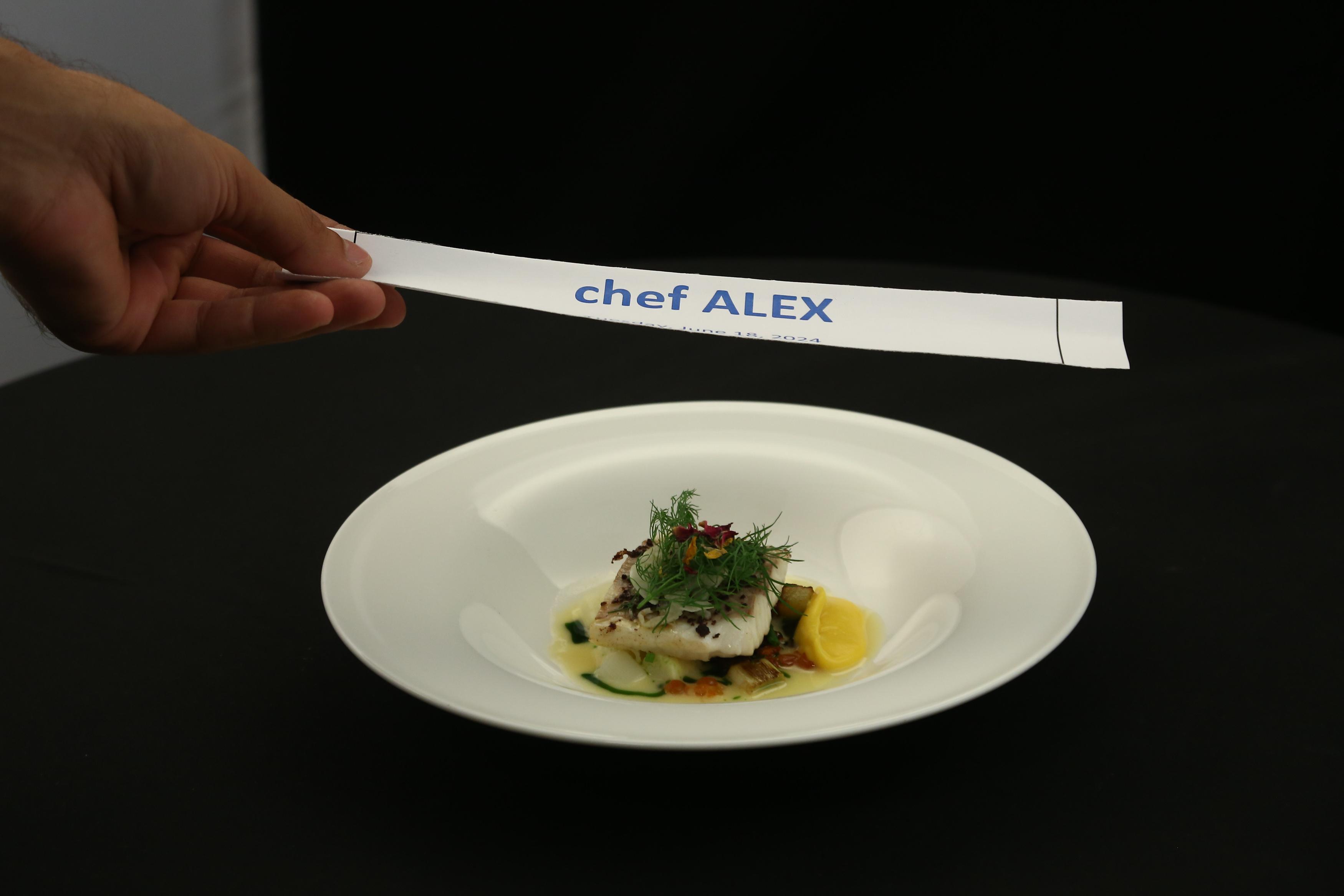 Chef Alexandru Sautner a gătit: file de sibas, pudră de măsline, sos beurre blanc cu sparanghel, ulei tahini, icre de știucă, piure de păstârnac și morcov, crocant de cartofi, morcovi și sparanghel alb.