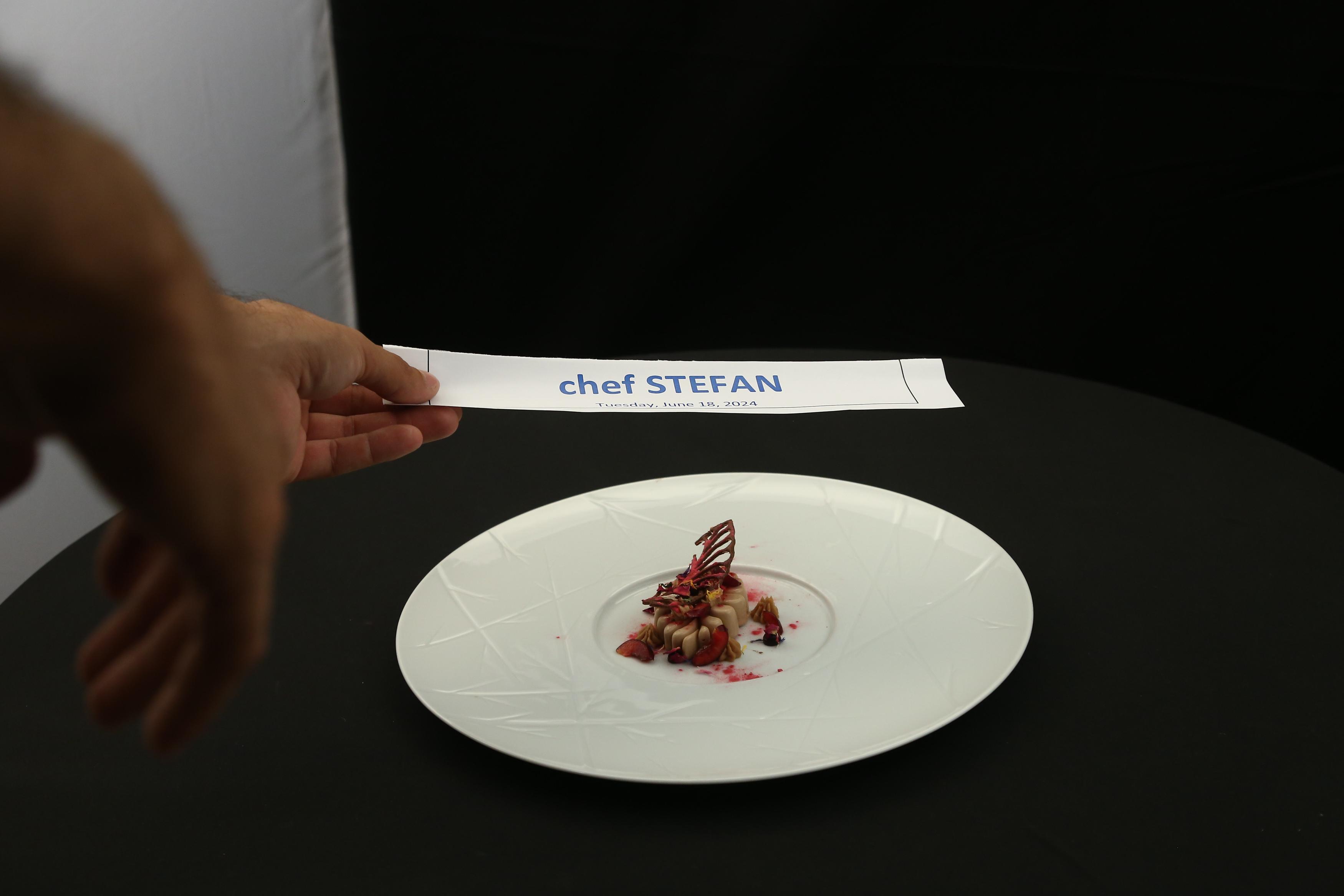 Chef Ștefan Popescu a gătit mousse de ciocolata gianduia cu inseție de piure de cireșe și cremă de ciocolată.