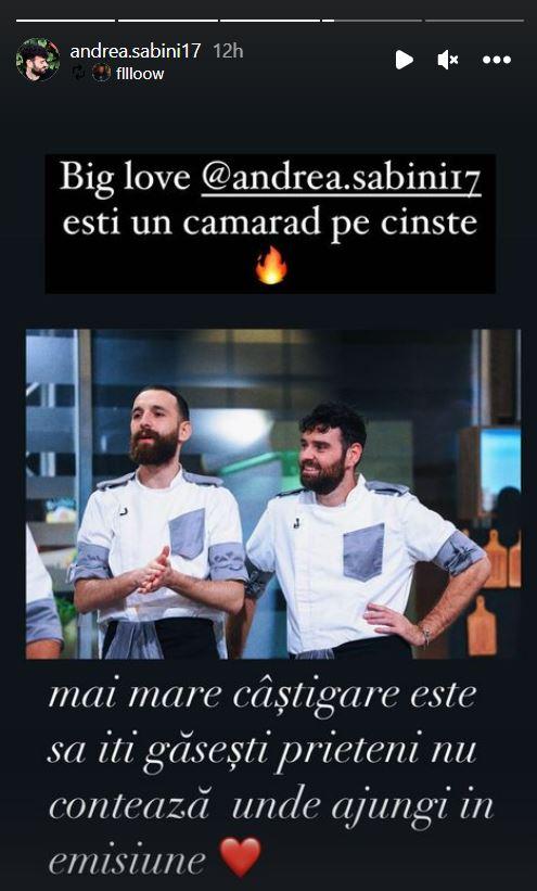 Printr-un mesaj, postat pe Instastory, concurentul din echipa gri de la Chefi la cuțite sezonul 11 a vornit despre relația care s-a creat între ei și i-a transmis toată dragostea sa lui Andrea Sabini.