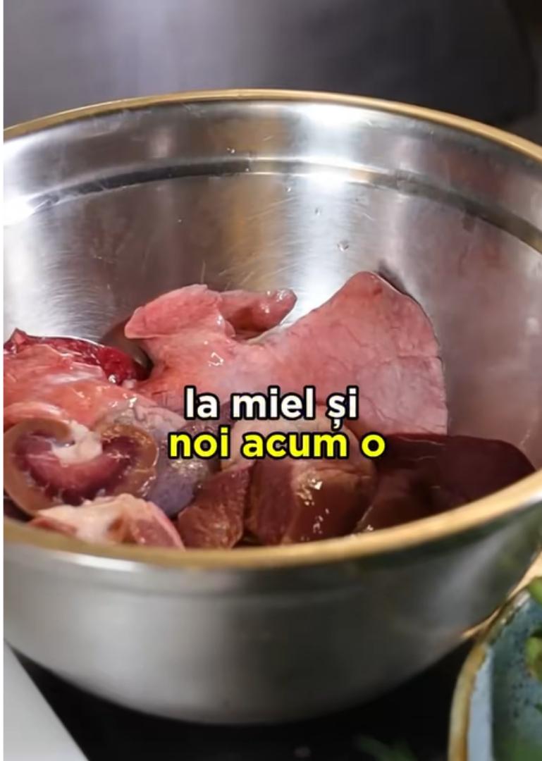 Mai întâi, chef Alaxandru Sautner a luat toate organele de la miel și le-a tăiat în bucăți mari, apoi le-a pus la fiert circa 40 de minute.