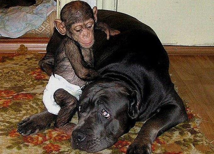 FOTO! Pui de cimpanzeu abandonat, crescut de un caine!
