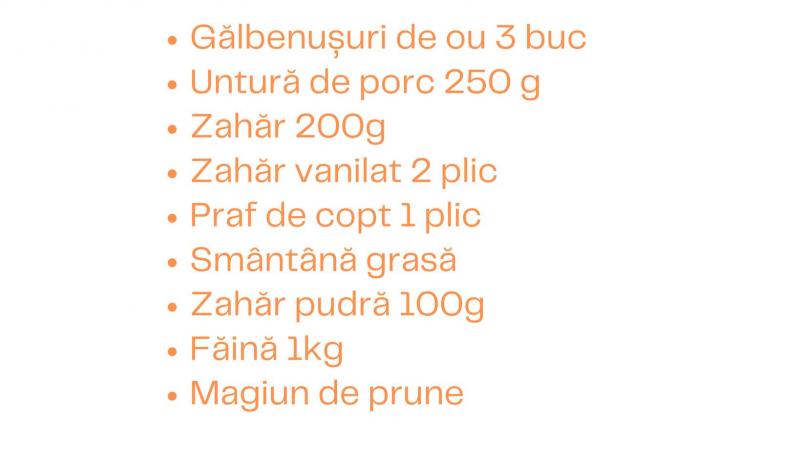 Primul pas este de a se pregăti o cană de untură de porc și de a separa gălbenușurile într-un bol. Se amestecă împreună și se adaugă o jumătate de cană de smântână (cu o grăsime de minim 30% obligatoriu). Se amestecă din nou și se toarnă două plicuri de zahăr vanilat (40 de grame), o jumătate de cană de zahăr, un pliculeț de praf de cop și 3 căni de făină și se frământă cu mâna totul.