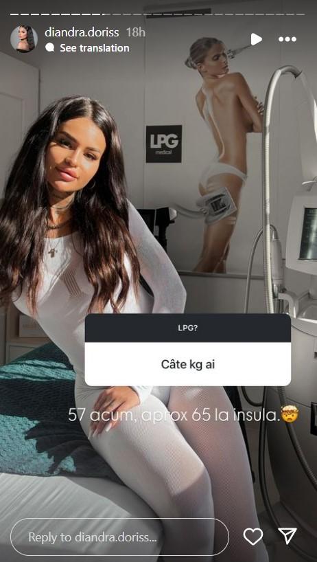 Ulterior, prietenii ei virtuali au vrut să afle cum a reușit să scape atât de rapid de kilogramele în plus acumulate în emisiune. Ispita Diandra a explicat că acum a revenit la stilul ei de viață: ține dietă, face sport și recent, a apelat și la o anumită metodă de remodelare corporală.