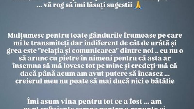 De asemenea, Ema le-a mulțumit internauților pentru mesajele frumoase. În plus, aceasta a dat de înțeles că are o comunicare dificilă cu cel care încă îi este soț și că trece prin momente dificile.