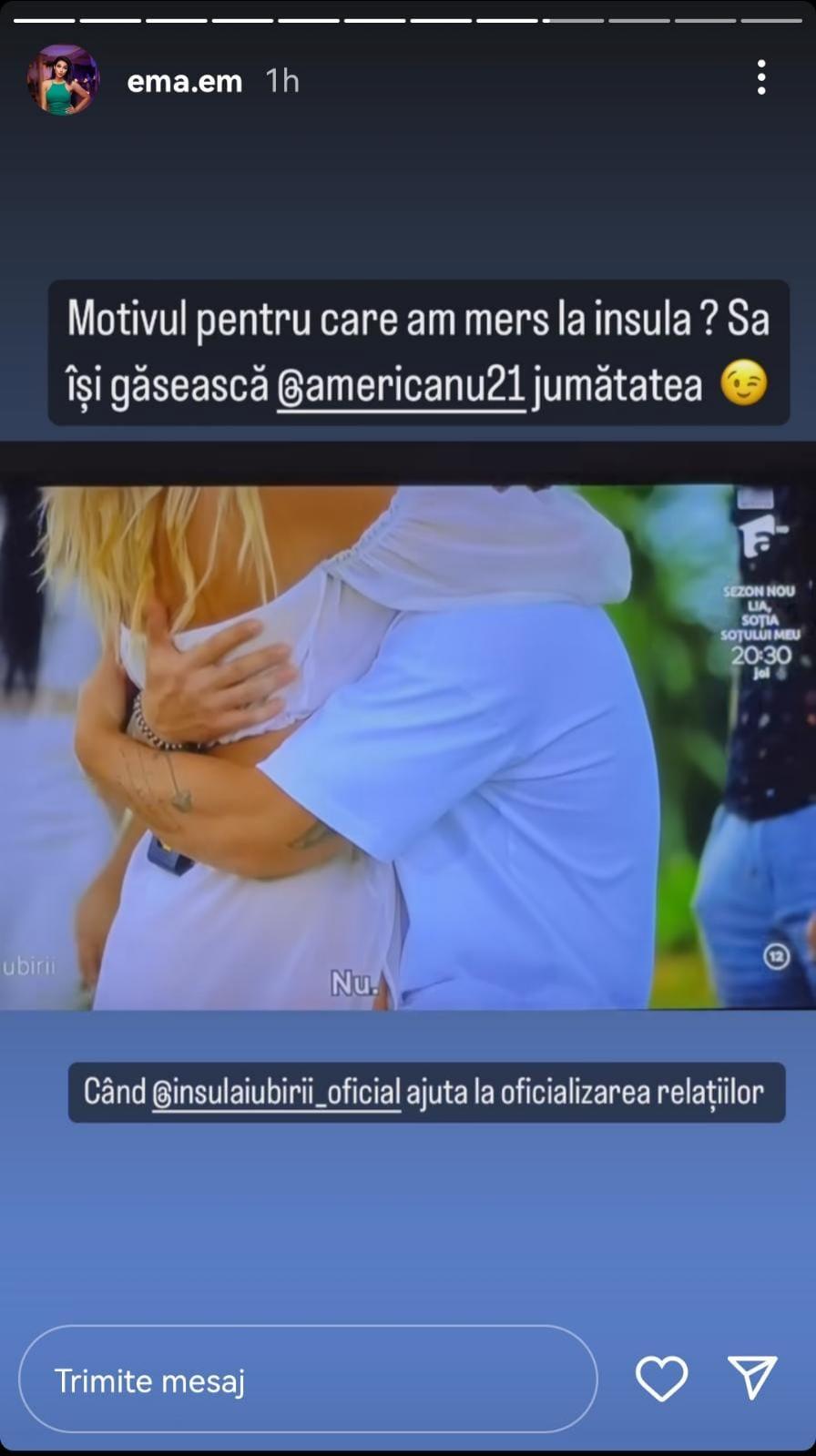 Văzând acel moment, Ema a reacționat: “Când crezi că ce atingi se și îndrăgostește de tine” / “Motivul pentru care am mers la Insula? Să își găsească @americanu21 (n.r Răzavn) jumătatea” / “Când Insula Iubirii ajută la oficializarea relațiilor”.