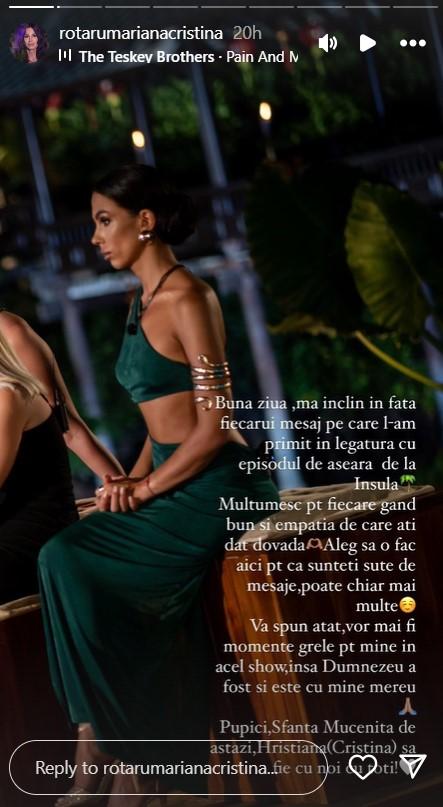 „Bună ziua ,ma înclin în fața fiecărui mesaj pe care l-am primit în legatura cu episodul de aseară de la Insula. Mulțumesc pt fiecare gând bun și empatia de care ați dat dovada. Aleg să o fac aici pentru că sunteti sute de mesaje, poate chiar mai multe. Vă spun atât, vor mai fi momente grele pentru mine în acel show, însă Dumnezeu a fost și este cu mine mereu. Pupici, Sfânta Muceniță de astăzi, Hristiana(Cristina) să fie cu noi cu toți!”, a scris Cristina de la Insula Iubrii, sezonul 8.