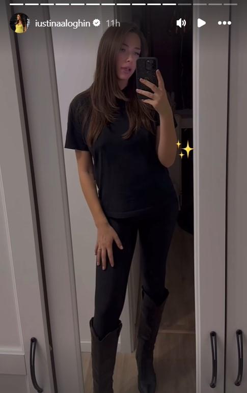 După ce a făcut turul camerei fetiței ei și le-a arătat urmăritorilor ei că acasă o aștepta și un tort roz cu numele Ivanei scris pe el, Iustina s-a filmat în oglindă purtând o pereche de colanți mulați și un tricou negru.