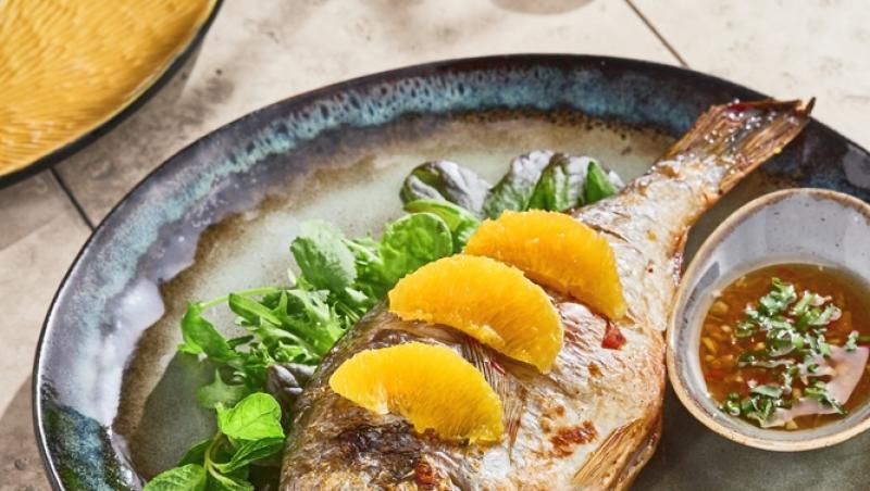 Pește întreg la grătar cu portocală, tarhon și vinegretă de oțet de sherry