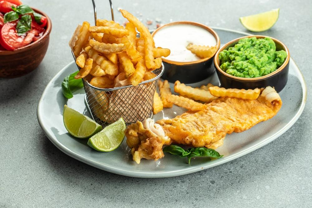 Fish & chips cu piure de mazăre și sos tartar