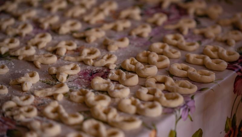 După ce aluatul a dospit, se împărte în aproximativ 10-12 bucăți mici și se răsucește fiecare bucată în formă de „8” sau de cruce.