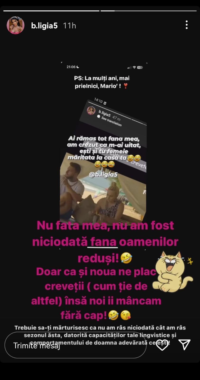 Amalia Ligia a răspuns și ea acestei înțepături clare: “Nu fata mea, nu am fost niciodată fana oamenilor reduși! Doar că și nouă ne plac creveții (cu ție de altfel), însă noi îi mâncăm fără cap! Trebuie să-ți mărturisesc că nu am mai râs niciodată cât am râs sezonul ăsta, datorită capacităților tale lingvistice și comportamentului de doamnă adevărat ce ești”.