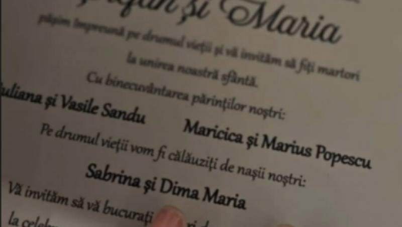 Nunta Mariei și a lui Ștefan din sezonul 9 Mireasa va avea loc pe 11 iulie 2026. Mai este foarte puțin pînă atunci, iar nașa însărcinată, Sabrina din sezonul 7 Mireasa, a publicat pe Instagram imagini cu invitația de nuntă. „Încă puțin”, a scris soția lui Dima în dreptul postării.
