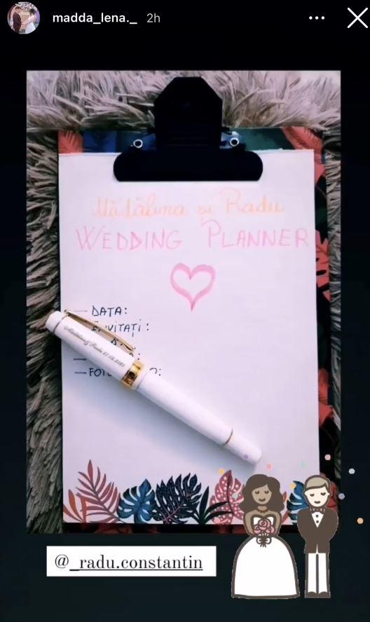 Mădălina Bobelică au anunțat pe contul de Instagram că ea și Radu se pregătesc de cununia religioasă. Tânăra a publicat o agendă pe care ea și iubitul său soț notau data cununiei, numărul invitaților, locația, foto/video.