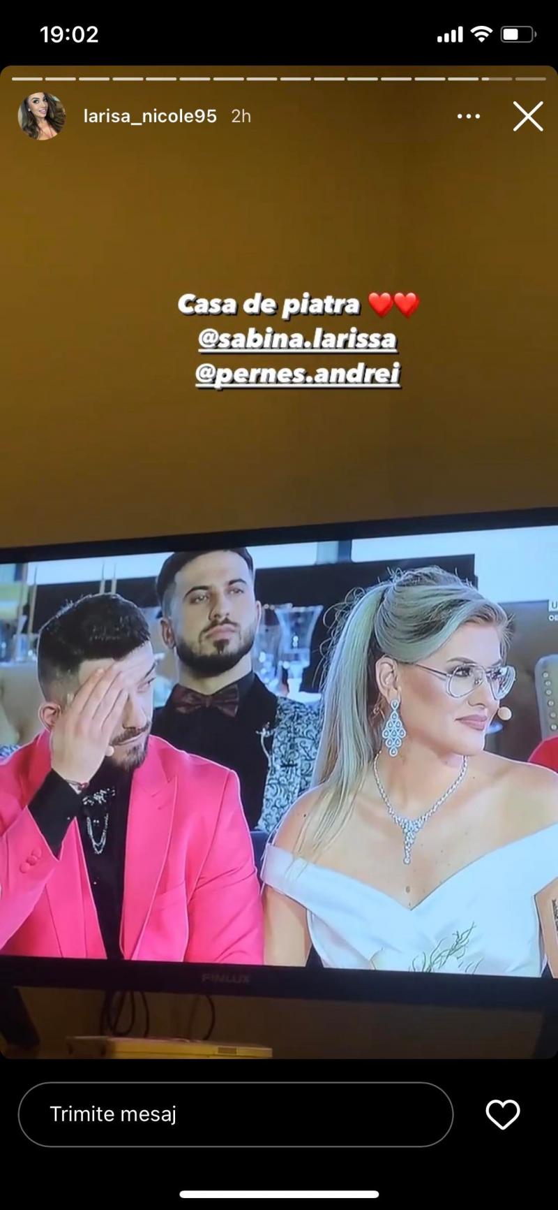 Din spatele televizorului, Larisa, fosta concurentă de la Mireasa sezonul 5, i-a susținut pe Sabrina și Perneș, cărora le-a urat casă de piatră. Cei doi nu au reușit să câștige marele premiu, însă cu siguranță iubirea dintre ei este mult mai puternică.