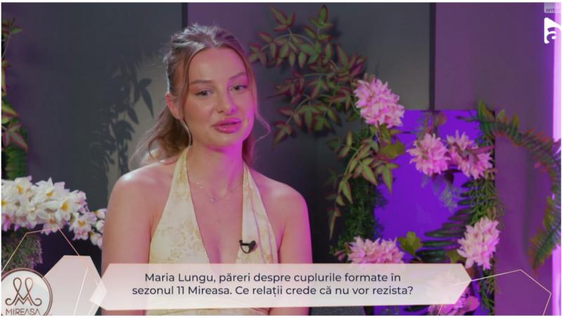 Maria Lungu a fost întrebată la Mireasa: Confesiuni de ce a venit în sezonul 11 Mireasa, în ce relații a rămas cu Robert și în ce procent a venit în emisiune pentru Marinescu. Tânăra a pretins că fostul iubit nu a fost motivul intrării ei în emisiune.