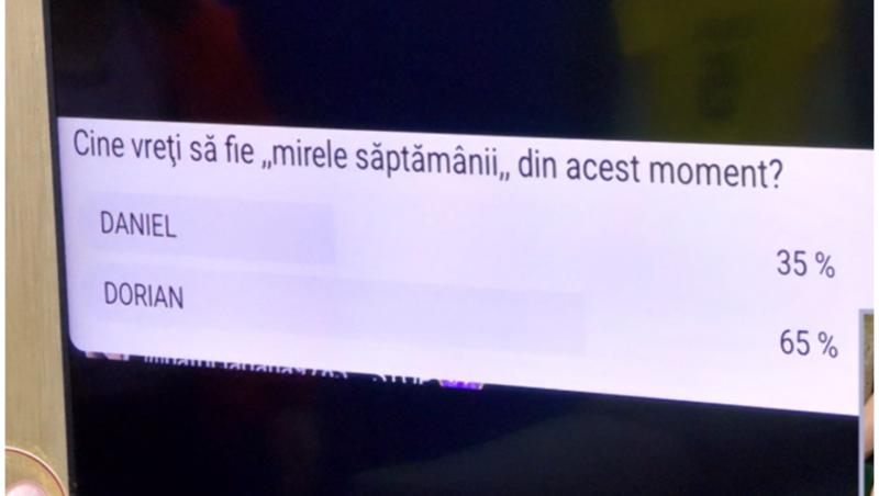 La întrebarea: Cine vreți să fie Mirele Săptămânii în acest moment? oamenii au votat în procent de 35% pentru Daniel și 65% pentru Dorian.