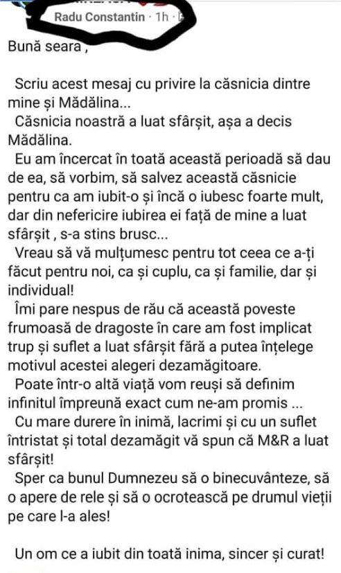 ”Căsnicia noastră a luat sfârșit, așa a decis Mădălina. Eu am încercat în acestă perioadă să dau de ea, să vorbim, să salvez această căsnicie pentru că am iubit-o și încă o iubesc foarte mult, dar din nefericire iubirea ei față de mine a luat sfârșit, s-a stins brusc... (...) Îmi pare nespus de rău că această poveste frumoasă de dragoste în care am fost implicat trup și suflet a luat sfârșit fără a putea înțelege motivul acestei alegeri dezamăgitoare.