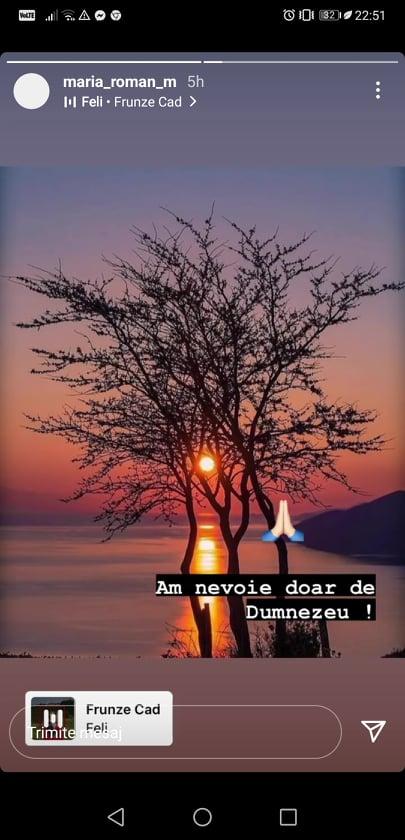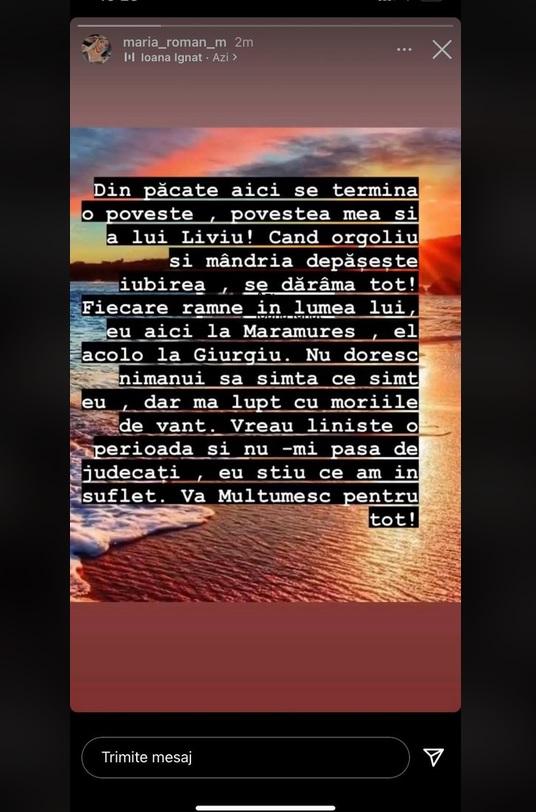 “Din păcate, aici se termină o poveste, povestea mea și a lui Liviu! Când orgoliul și mândria depășesc iubirea, se destramă tot! Fiecare rămâne în lumea lui, eu aici la Maramureș, el acolo la Giurgiu. Nu doresc nimănui să simtă ce simți eu, dar mă lupt cu morile de vânt. Vreau liniște o perioadă și nu-mi pasă de judecăți, eu știu ce am în suflet. Vă mulțumesc pentru tot!", a scris Maria pe InstaStory.