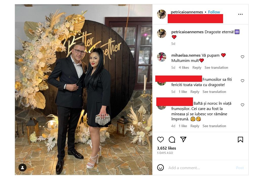 Petrică a fost cel care a postat fotografia însoțită de mesajul care ne oferă un tablou al relației celor doi: “Dragoste eternă!”