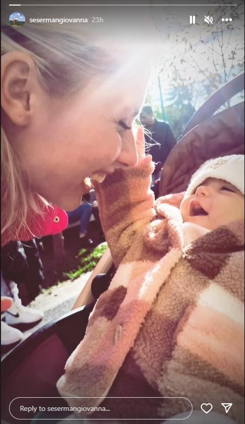 Giovana a publicat pe rețelele sociale o fotografie în care apare râzând în momentul în care fetița, aflată în cărucior, își atinge mama pe față.