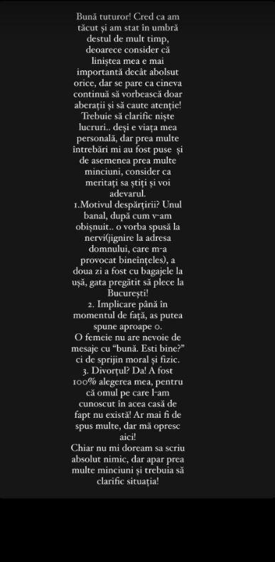 ”Bună tuturor! Cred că am tăcut și am stat în umbră destul de mult timp, deoarece consider că liniștea mea e mai importantă decât absolut orice, dar se pare că cineva continuă să vorbească doar aberații și să caute atenție! Trebuie să clarific niște lucruri... deși e viața mea personală, dar prea multe întrebări mi-au fost puse și de asemenea prea multe minciuni, consider că meritați să știți și voi adevărul.