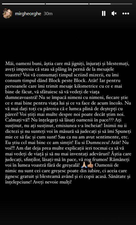 ”Măi, oameni buni, ăștia care mă jigniți, înjurați și blestemați, aveți impresia că stau să plâng în pernă de la mesajele voastre? Voi vă consumați timpul scriind mizerii, eu îmi consum timpul dând block peste block. Atât! Iar pentru persoanele care îmi trimit mesaje kilmetrice cu ce e mai bine de făcut, vă sfătuiesc să vă vedeți de viața dumneavostră! Nu se împacă nimeni cu nimeni, fiecare știe ce e mai bine pentru viața lui și ce va face de acum încolo. Nu vă mai dați toți cu părerea că e lumea plină de deștepți cu părere! Voi știți mai multe despre noi poate decât știm noi.