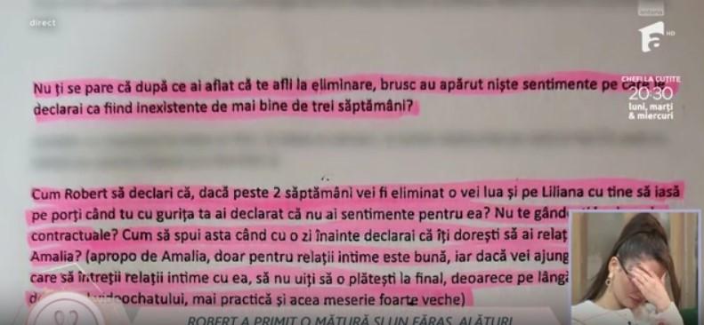 În rândurile respective, Robert era acuzat că se apropie de Liliana de teama eliminării și că o pune în posturi neplăcute, precum cea din seara de film, când a ținut-o în brațe.