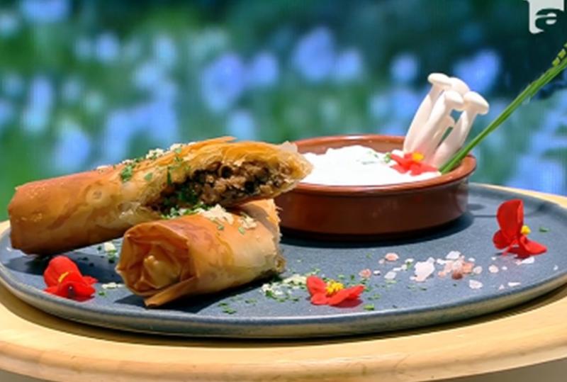 Pachețelele de primăvară sunt de fapt rulouri din foi de plăcintă umplute cu carne tocată și ciuperci, prăjite în ulei și servite cu un delicios sos tzatziki.