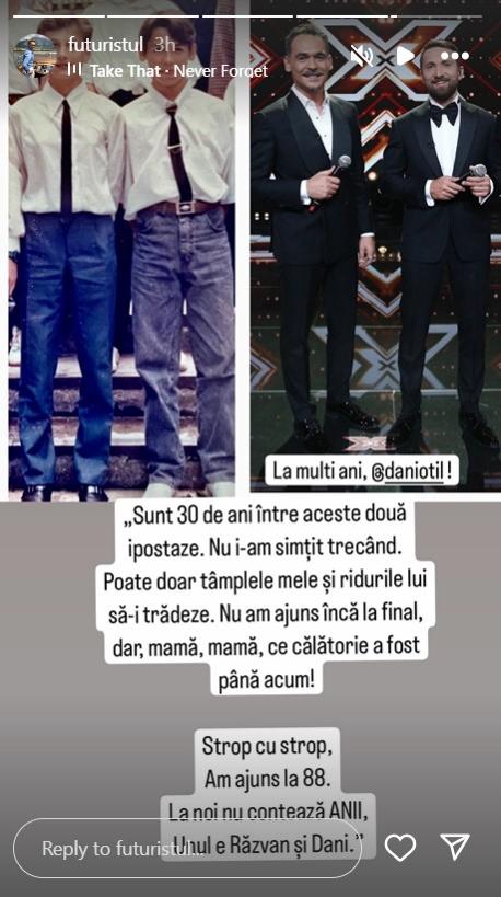 Ulterior, într-in colaj cu imaginea din curtea școlii și o fotografie de la X Factor, Răzvan a notat: „Sunt 30 de ani între aceste două ipostaze. Nu i-am simțit trecând. Poate doar tâmplele mele și ridurile lui să-i trădeze. Nu am ajuns încă la final, dar, mamă, mamă, ce călătorie a fost până acum!