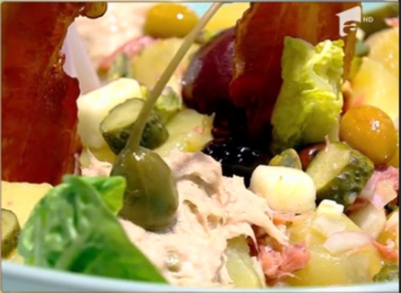 Este de fapt o combinație între clasica salată orientală și salata de ton, la care a mai adăugat multe alte ingrediente și a rezultat un preparat absolut gustos și consistent. Salata poate fi servită ca aperitiv, dar poate constitui și baza unei mese principale din zi, la cât de consistentă este.