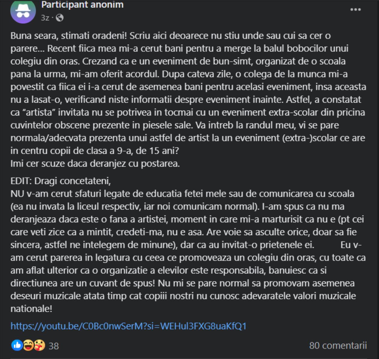 „Bună seara, stimați orădeni! Scriu aici, deoarece nu știu unde sau cui să cer o părere… Recent fiica mea mi-a cerut bani pentru a merge la Balul Bobocilor al unui colegiu din oraș. Crezând că este un eveniment de bun-simt, organizat de o școală până la urmă, mi-am oferit acordul. După câteva zile, o colegă de la muncă mi-a povestit că fiica ei i-a cerut, de asemenea, bani pentru același eveniment, însă aceasta nu a lăsat-o, verificând niște informații despre eveniment înainte. Astfel, a constatat că <<artista>> invitată nu se potrivea întocmai cu un eveniment extrașcolar din pricina cuvintelor obscene prezente în piesele sale. Vă întreb, la rândul meu, vi se pare normală/adecvată prezența unui astfel de artist la un eveniment (extra)școlar ce are în centru copii de clasa a noua, de 15 ani? Îmi cer scuze dacă deranjez cu postarea.