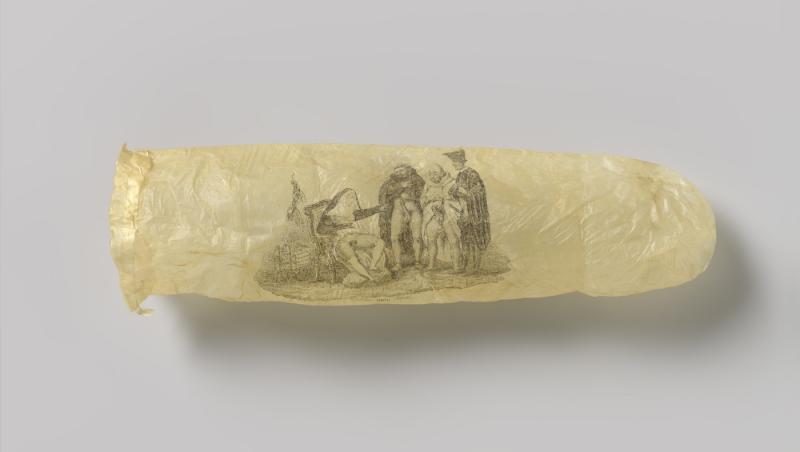 Un prezervativ rar, datând din jurul anului 1830, decorat cu o gravură erotică reprezentând o călugăriţă şi trei clerici în ipostaze provocatoare, este expus la Rijksmuseum din Amsterdam, conform news.ro.