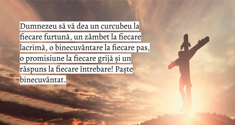 - Dumnezeu să vă dea un curcubeu la fiecare furtună, un zâmbet la fiecare lacrimă, o binecuvântare la fiecare pas, o promisiune la fiecare grijă și un răspuns la fiecare întrebare! Învierea Domnului să îţi aducă în suflet bucurie și iubire. Paște fericit, alături de cei dragi!