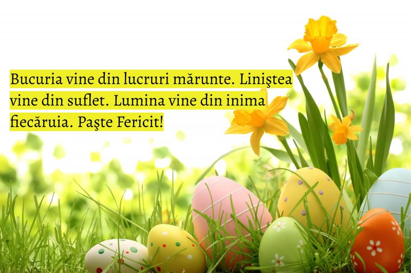 - Pomii înfloriți, mireasma florilor și ciripitul păsărilor șoptesc că a sosit Paștele. Sufletul să-ți fie cald atât în aceste zile de sărbătoare, cât și în fiecare zi a vieții tale. Paște fericit!