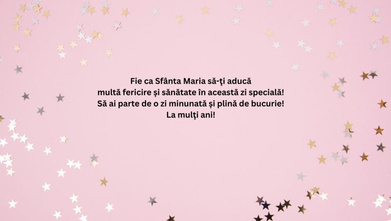 - La mulți ani de Sfânta Maria! Îți trimit cele mai calde urări de sănătate, fericire și succes. Să ai parte de toate darurile vieții și să trăiești fiecare zi cu bucurie și recunoștință.