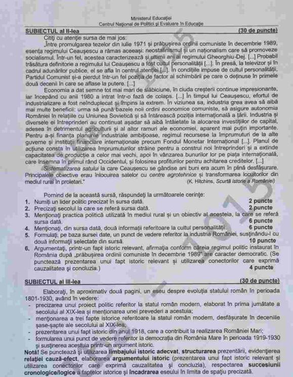 Iată ce subiecte au avut de rezolvat elevii de la profil uman. La prima cerință, punctată cu 30 de puncte, s-a cerut analizarea unui text care aparține lui I.A.POP, I.Bolovan, din Marea istorie ilustrată a României și a Republicii Moldova.