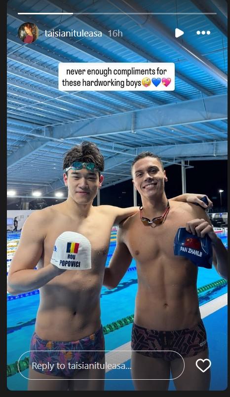 După terminarea semifinalei, David Popovici și Pan Zhanle au avut timp să discute, mai mult decât atât, ei au făcut schimb de căști de înot. Momentul a fost surprins de iubita lui David, Taisia Nițuleasa. Tânăra a postat imaginea pe contul său de Instagram, arătând urmăritorilor săi respectul reciproc pe care și-l poartă unii dintre cei mai buni sportivi din lume.