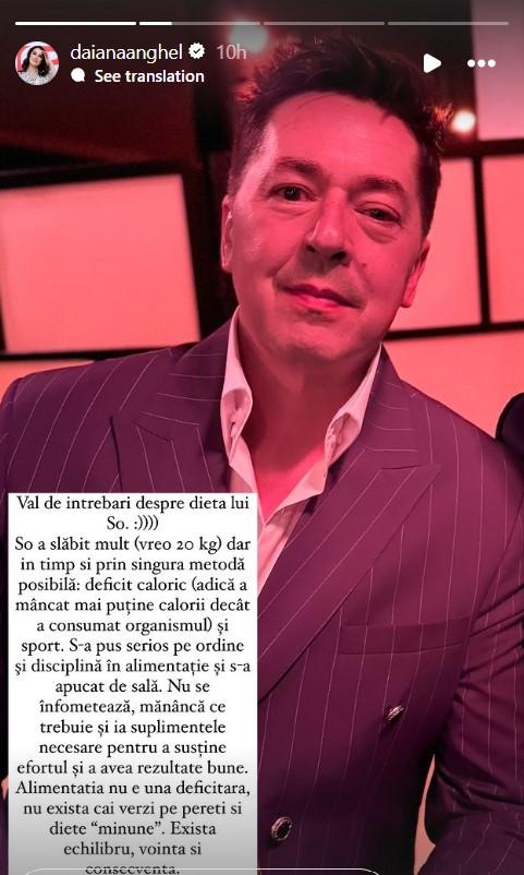 “Val de întrebări despre dieta lui So. So a slăbit mult (vreo 20kg), dar în timp și prin singura metodă posibilă: deficit caloric (adică a mâncat mai puține calorii decât a consumat organismul) și sport. S-a pus serios pe ordine și disciplină în alimentație și s-a apucat de sală. Nu se înfometează, mănâncă ce trebuie și ia suplimentele necesare pentru a susține efortul și a avea rezultate bune. Alimentația nu e una deficitară, nu există cai verzi pe pereți și diete “minune”. Există echilibru, voință și consecvență”, a scris soția lui Sorin Gonțea.
