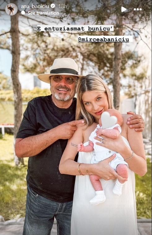 De curând, Ana Baniciu a postat pe Insta Story o fotografie emoționantă cu tatăl ei, Mircea Baniciu, și cu micuțul ei. În fotografie, Ana îl ține în brațe pe fiul ei și ase află alături de tatăl ei care zâmbește larg, fiind vizibil emoționat de noua ipostază, aceea de bunic.